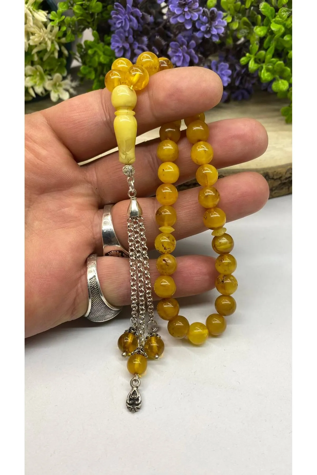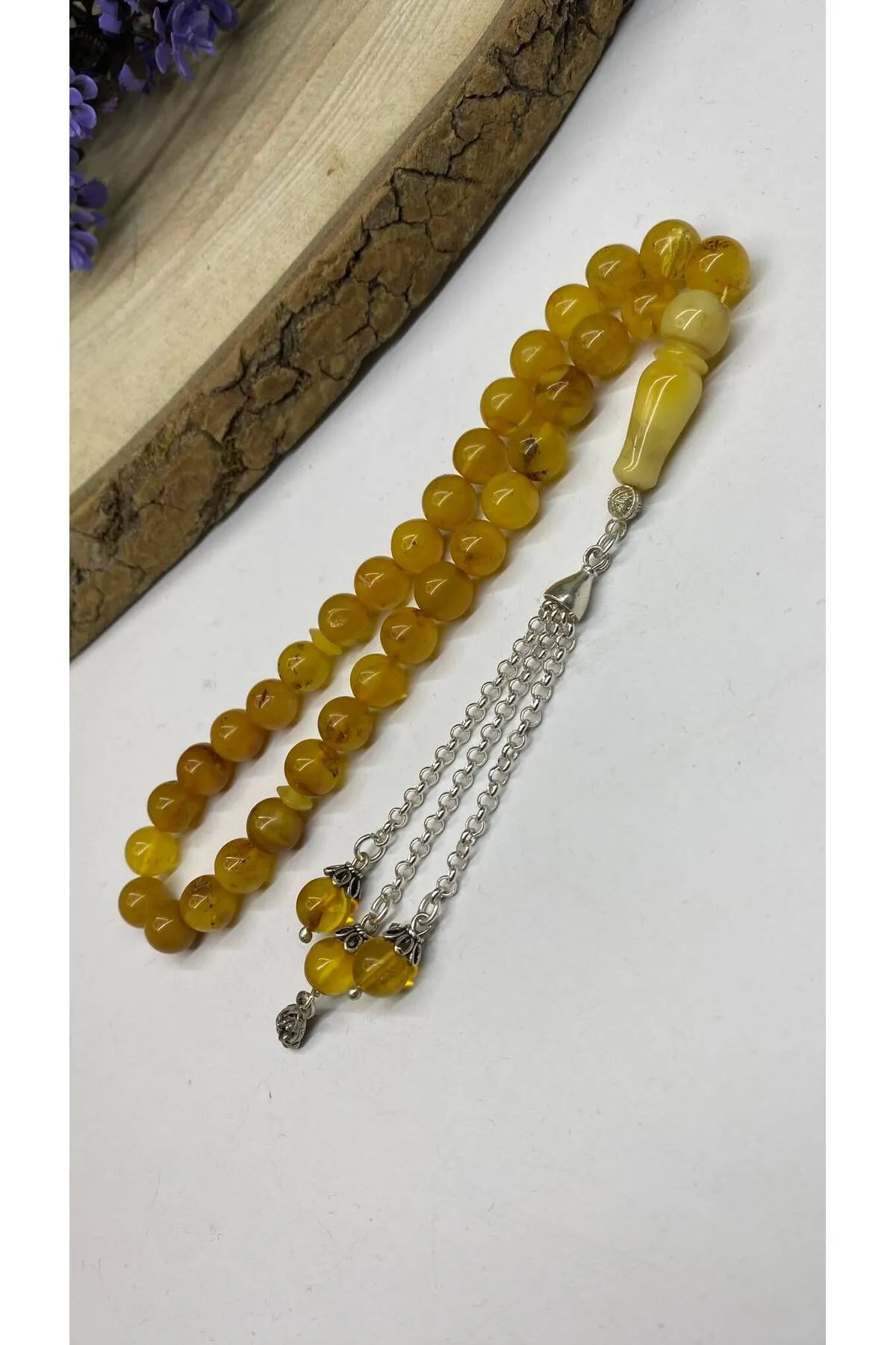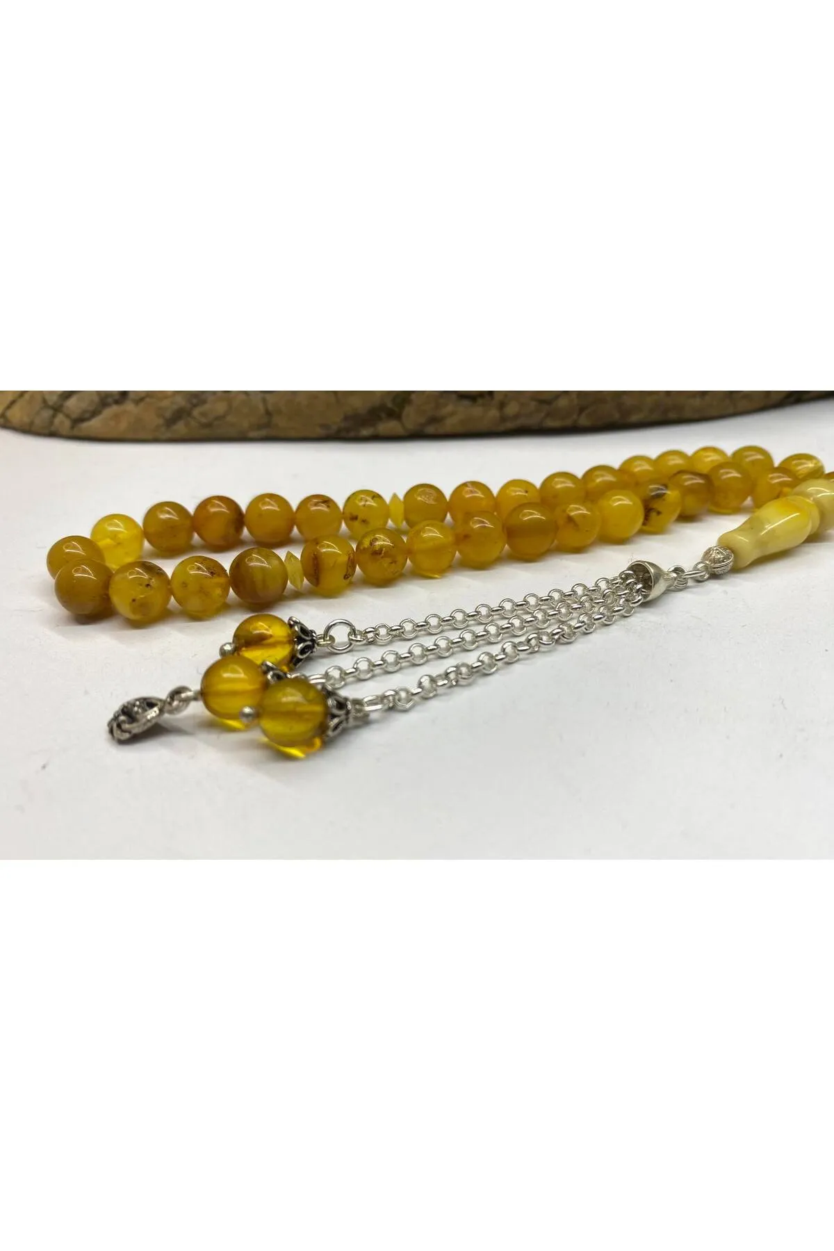 Doğal kehribar taşı, benzersiz desenleriyle dikkat çeken bu tesbih, her kullanımda doğanın güzelliklerini hissettirir; Fosilli kaya damla kehribar materyali, hem estetik hem de dayanıklılık açısından üstün bir seçimdir; uzun süreli kullanım için idealdir; Kehribarın sıcak ve doğal tonları, her ortamda zarif bir dokunuş sağlar ve kişisel tarzınıza özgün bir hava katar;
