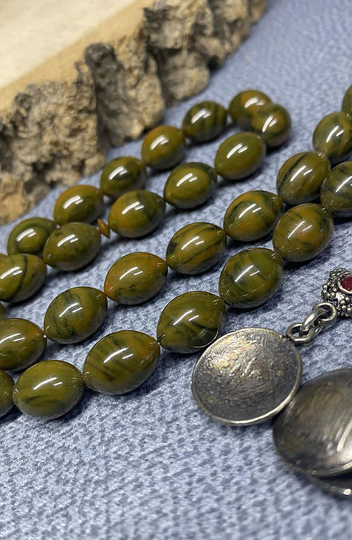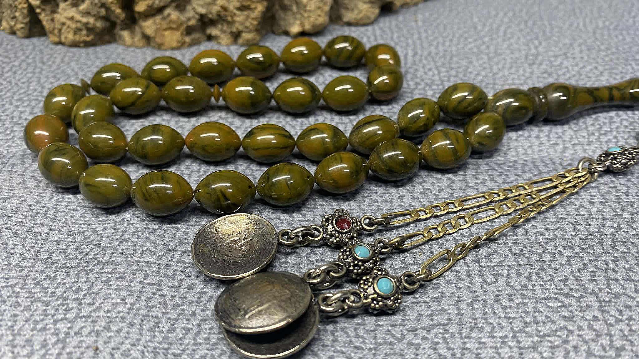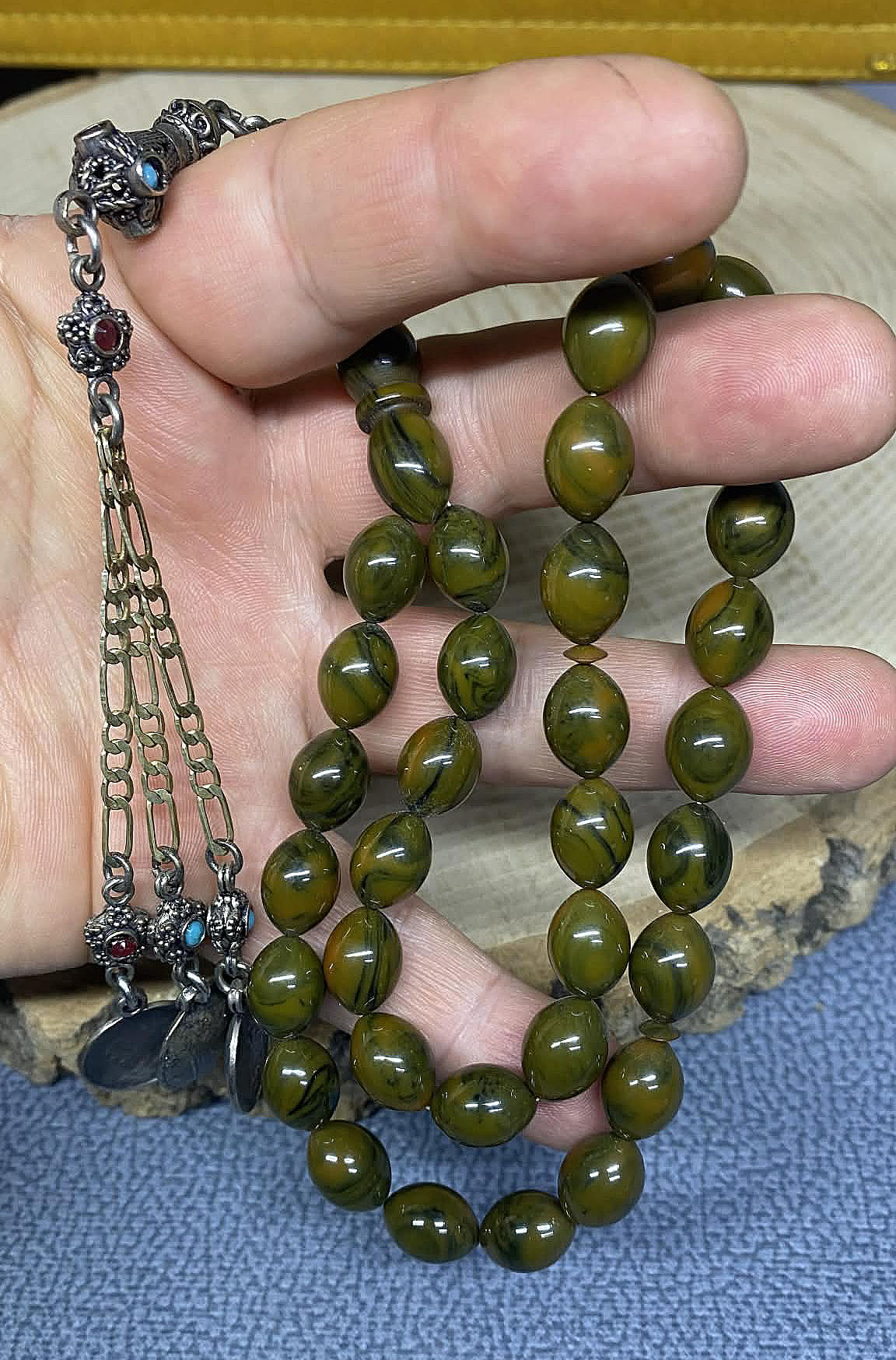 Doğal yeşil tonları, hareli ve damarlı yapısıyla dikkat çeken bu 10×13 mm arpa kesim katalin tesbih, estetik görünümü ve koleksiyon değeri ile öne çıkan özel parçalardan biridir. Eski üretim olması ve zamanla renk almış yapısı, ürüne karakteristik bir görünüm ve otantik bir hava kazandırmaktadır.