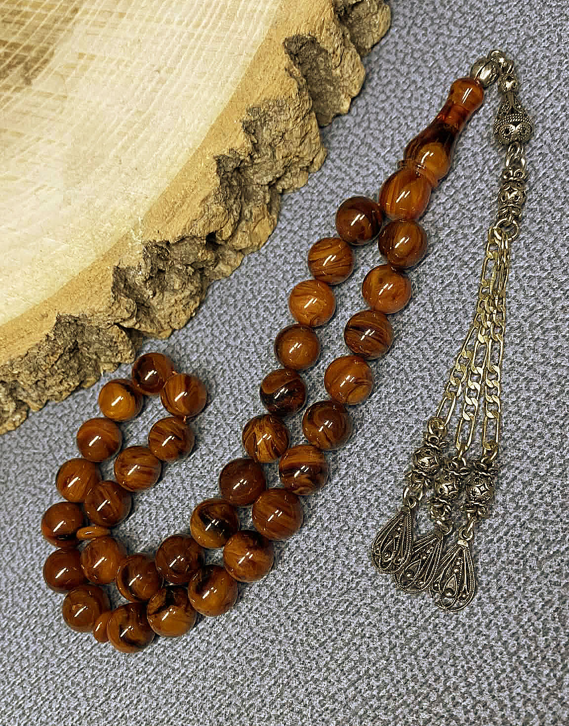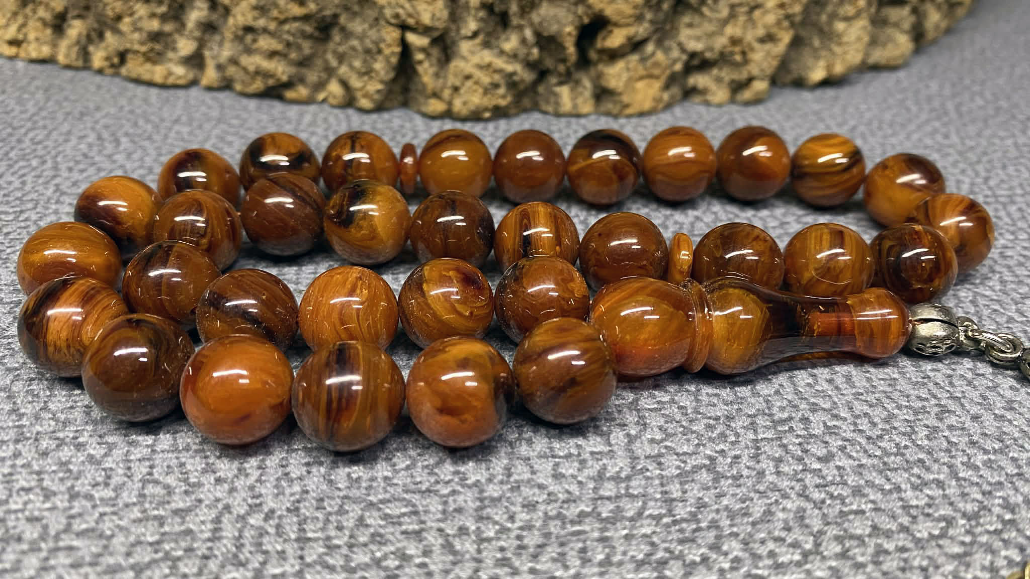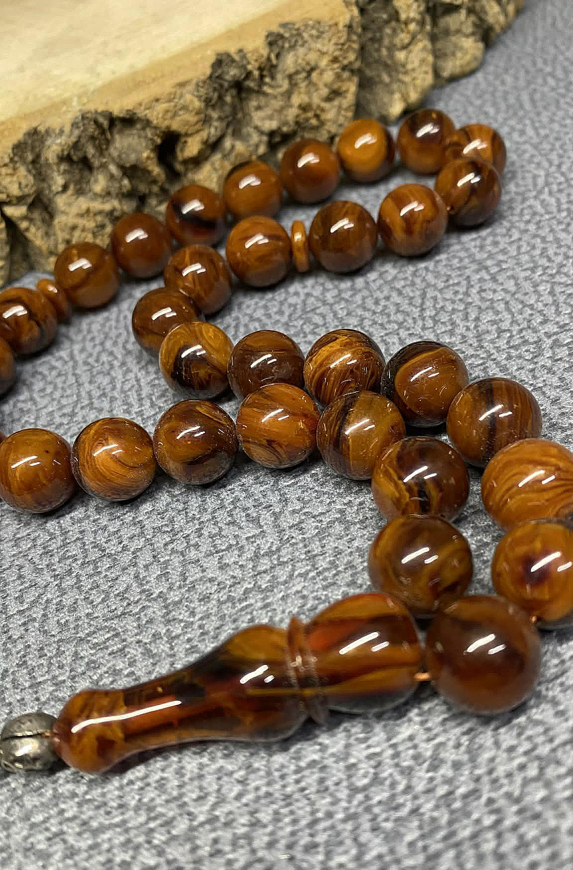 Eski üretim olması, ürüne yalnızca görsel bir değer değil aynı zamanda koleksiyonluk bir kimlik kazandırır. Zamanla oluşan doğal renk geçişleri ve yüzey karakteri, her tesbihi benzersiz hale getirir. Bol damarlı ve hareli yapısı, ışık altında farklı açılarda zengin ton oyunları oluşturarak ürüne derinlik katar.